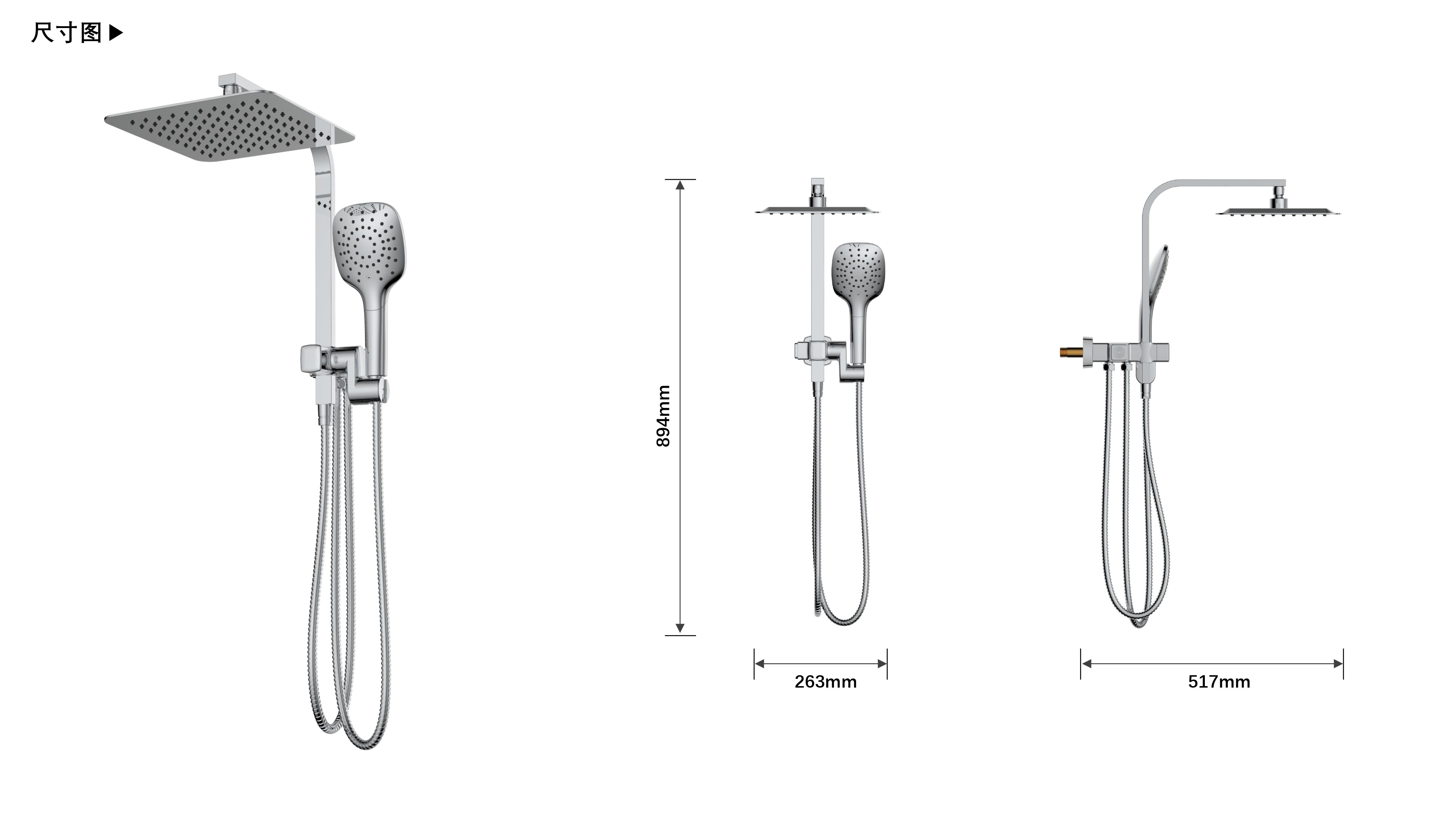 方形寬大頂噴;Z字形三通;按壓切換頂噴/花灑出水